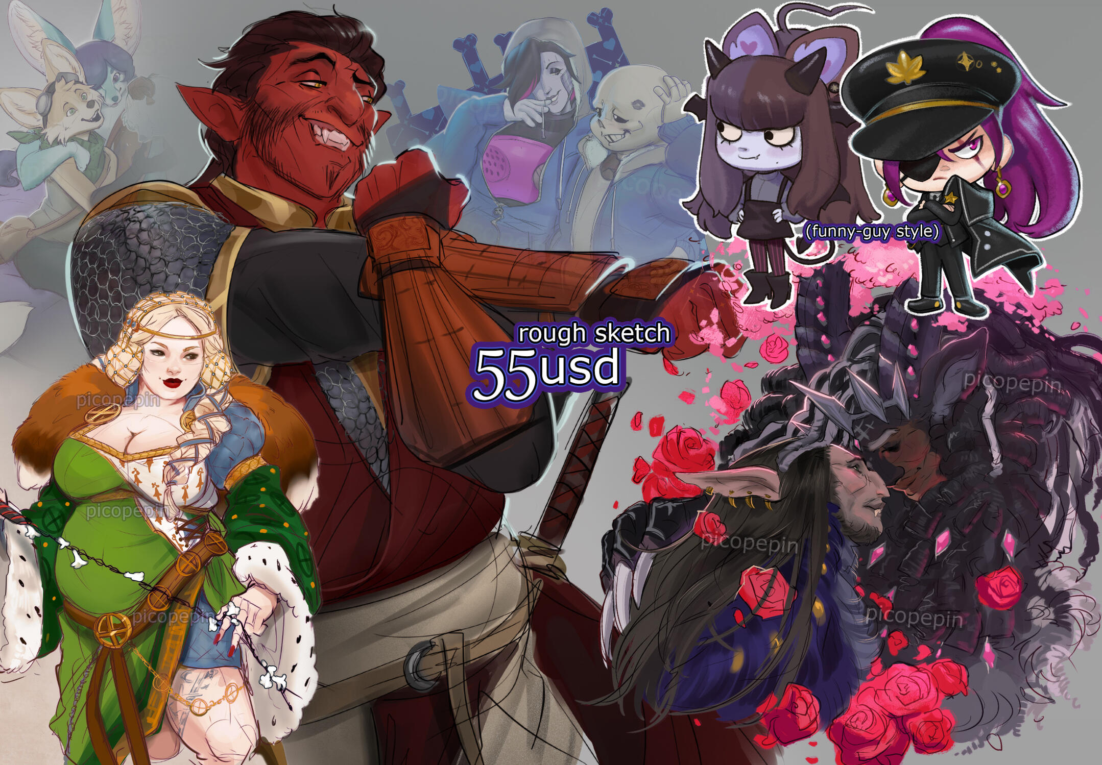 Additional characters are already factored into the price, negotiation and adjustments to cost will be made upon inquiry depending on the intensity of the subject/idea. If you are getting more than 2 fullbodied characters (ie, a group like the Ghostfamzine picture) we will need to discuss cost.
